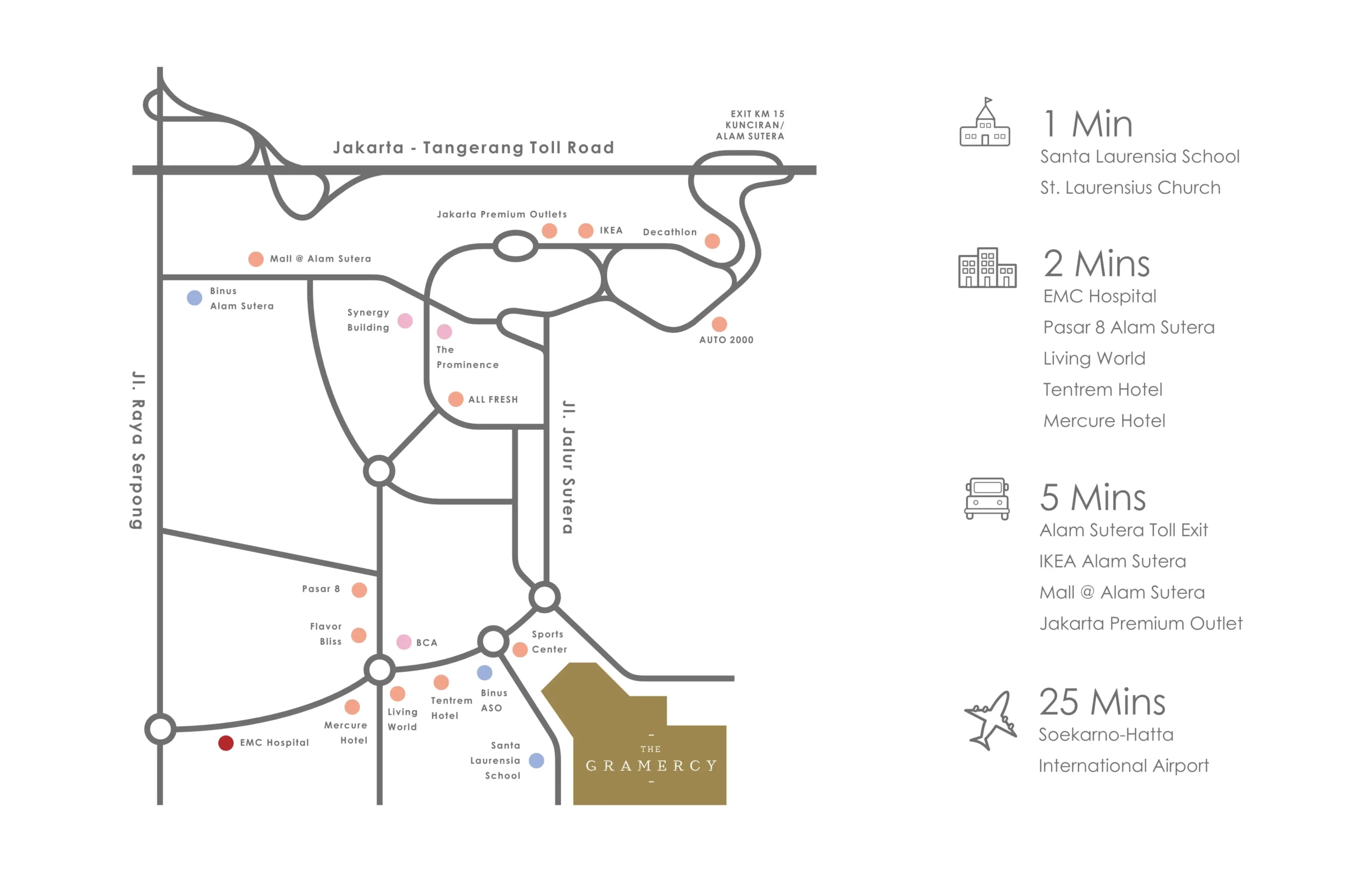 With multiple access points, it ensures easy mobility to the toll gate leading to Soetta Airport, Bogor - Jakarta, & Merak.